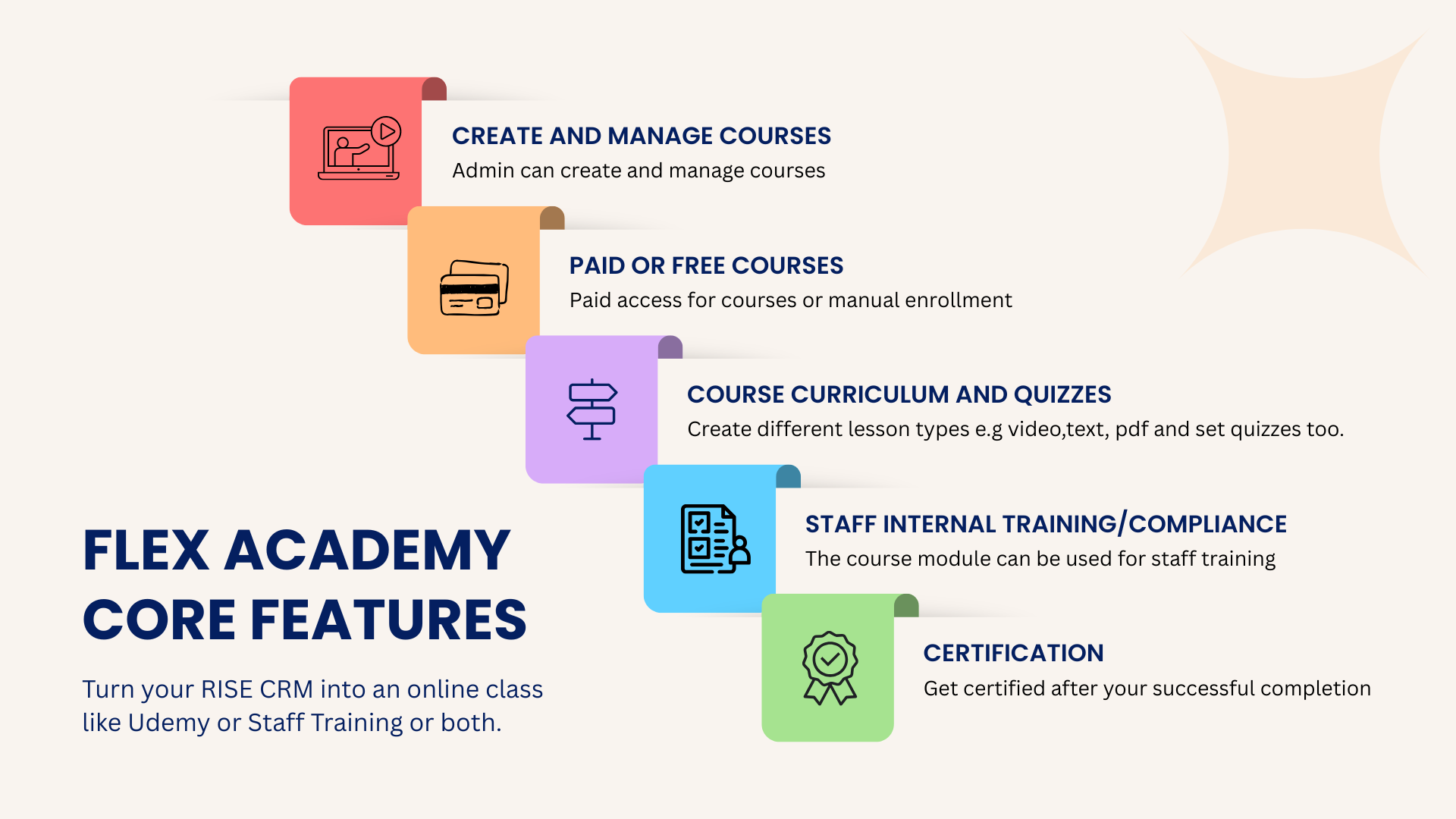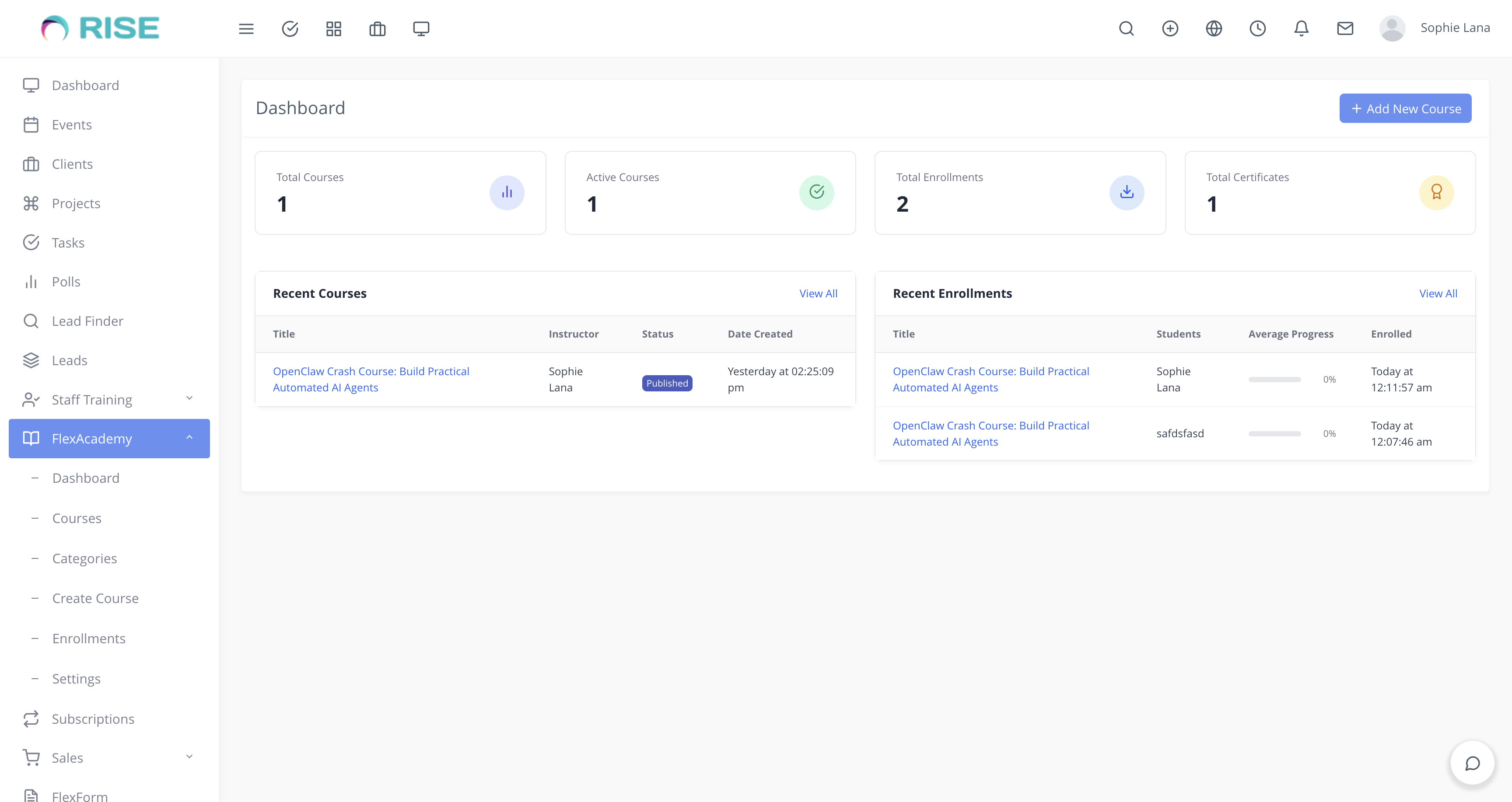 Whether you’re training staff, educating clients, or selling online courses — FlexAcademy gives you everything you need to deliver high-quality e-learning and professional certification inside your RISE CRM.