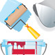 Vector set of Christmas design elements: Santa helper girl, Santa bird, Christmas tree, gift box with bow, christmas bells, holly, star, gingerbread man, candy cane, christmas decoration, apple, shopping bag full of Christmas presents. Isolated on black background.