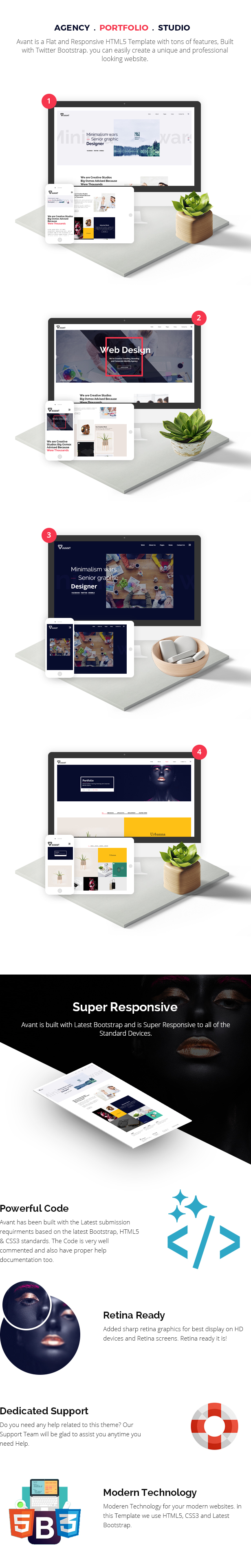 Avant is a Creative & Parallax HTML5 template best suitable for creative agencies, studios, digital design agencies or other similar business. Avant will help you to make any website like creative startups, professional photographer, portfolio agency or other business very easily as it has been coded in Bootstrap and CSS3.
